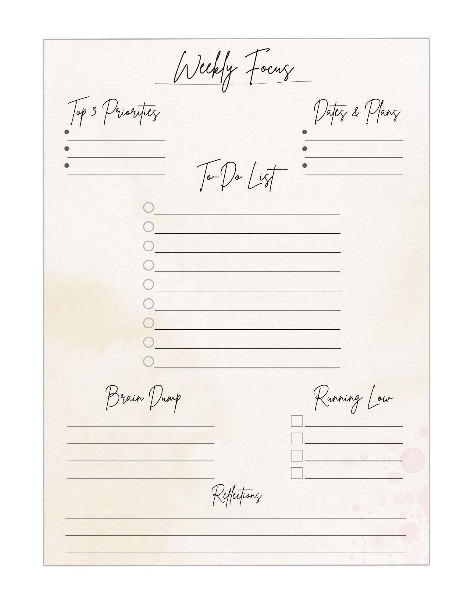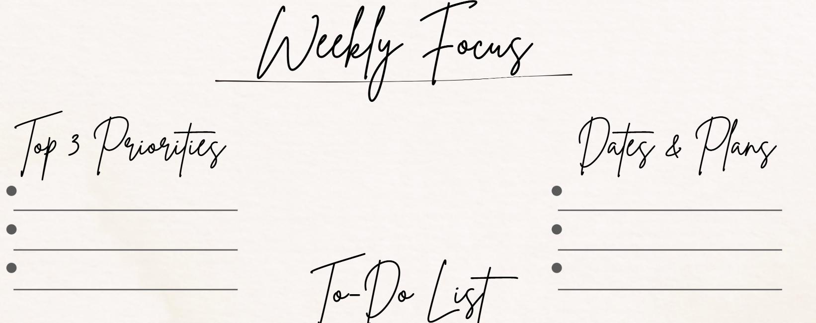 ✨ WHAT’S INCLUDED 1 Weekly Focus Planner Page US Letter size (8.5 x 11) High-resolution PDF Clean, minimal, neutral aesthetic (This is a digital download — no physical item will be shipped.)
