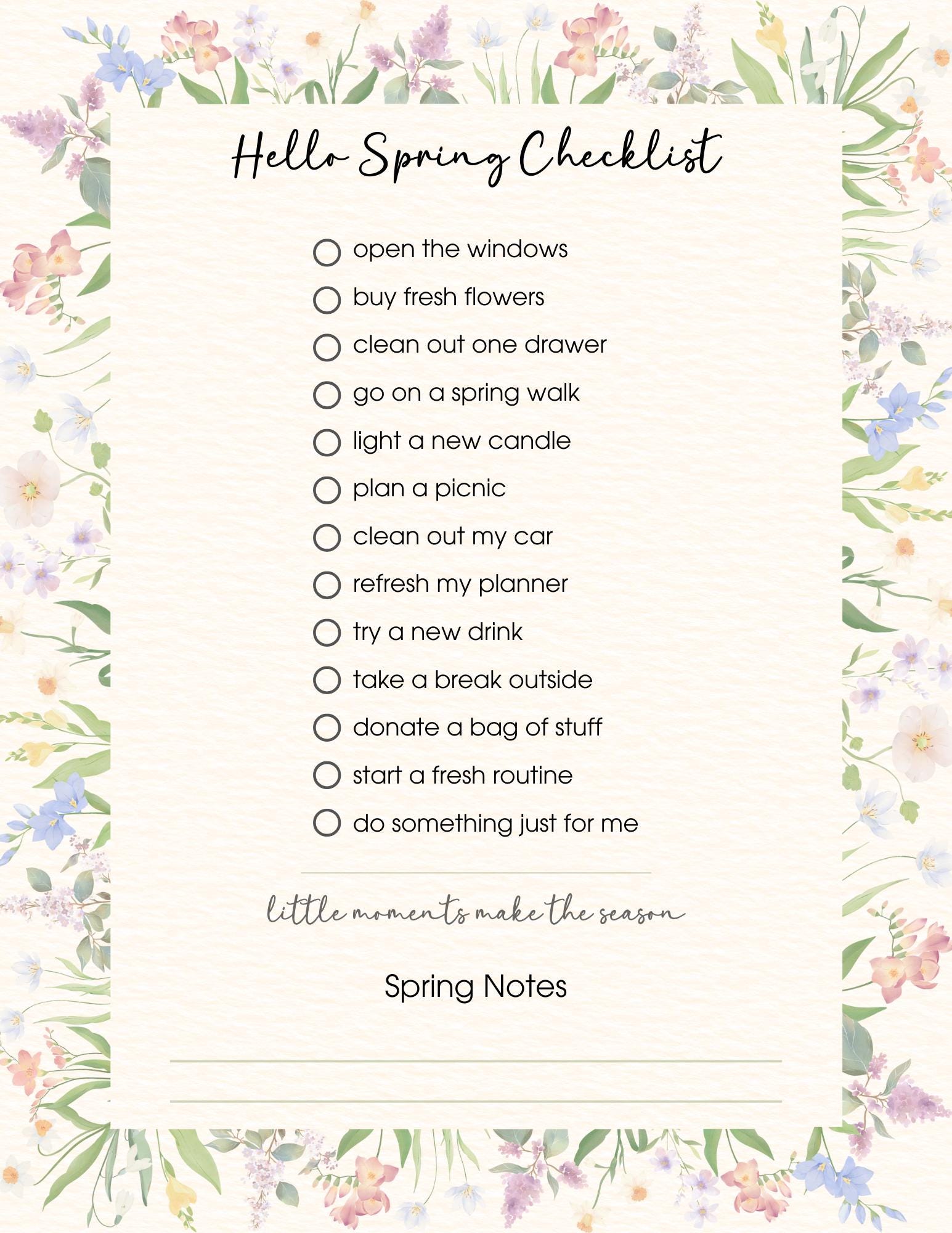🌼 FEATURES • Spring-themed checklist • Consistent checkbox layout • Soft neutral background with watercolor florals • Space for notes at the bottom • Calm, clutter-free design • Instant digital download