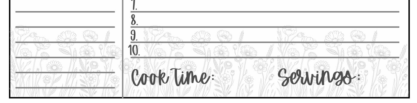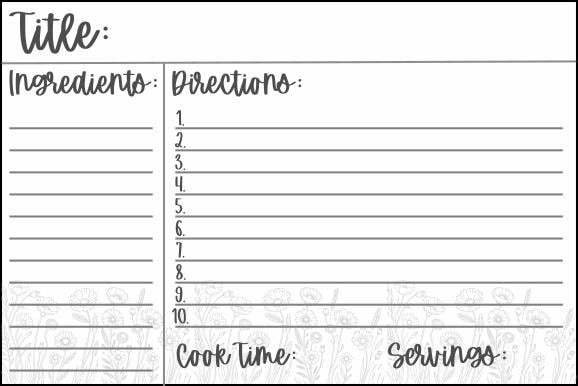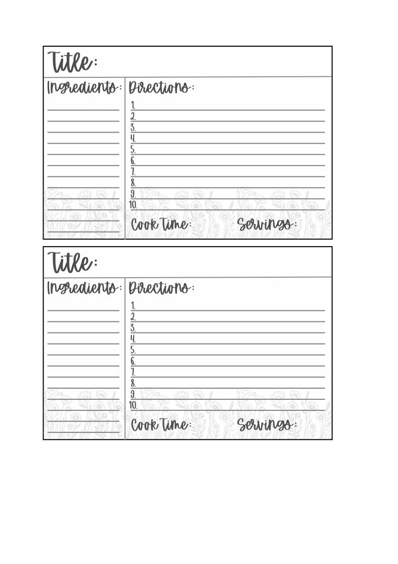 WHAT YOU’LL RECEIVE • 1 PDF file • US Letter size (8.5 x 11) • 2 recipe cards per page (4 x 6 each) • Black & white for easy printing • Sections included: Title, Ingredients, Directions, Cook Time, and Servings