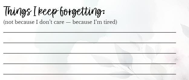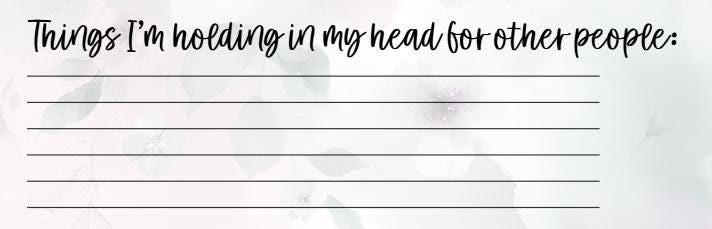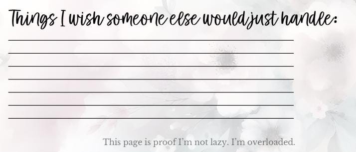 • 1 printable PDF (US Letter – 8.5x11) • Soft floral watercolor background • Clean, easy-to-use layout that prints beautifully • Sections for: – Things you’re holding in your head for other people – Things that feel urgent but actually aren’t – Things you keep forgetting (because you’re tired, not careless) – Things you wish someone else would just handle