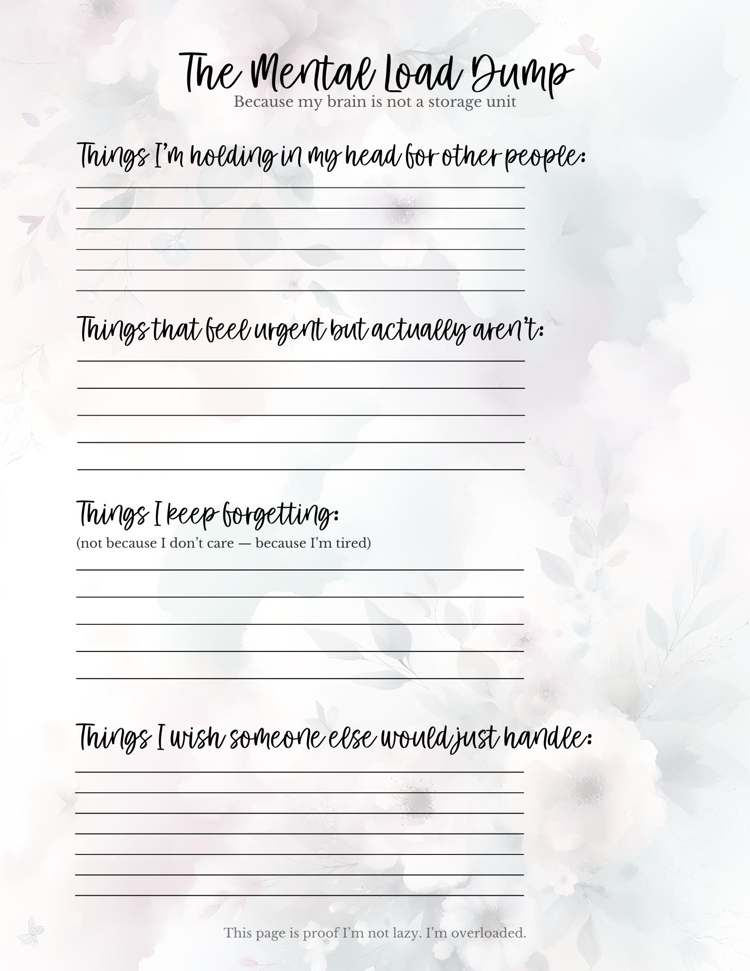 This Mental Load Dump – Soft Floral Edition was designed for moments when your brain feels heavy, cluttered, and emotionally tired — and you want a gentler way to let it all out.