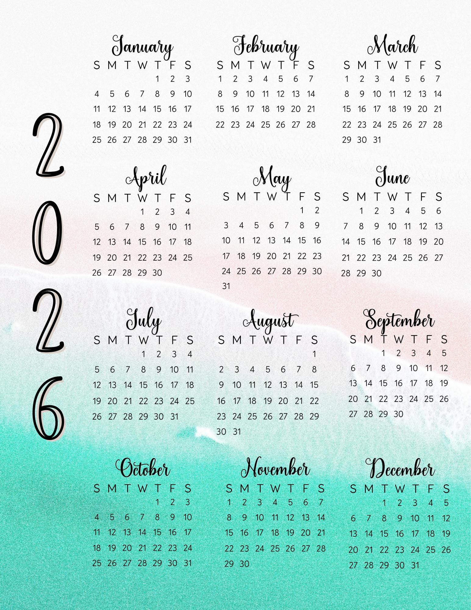 This 2026 year-at-a-glance calendar features a soft teal beach watercolor background with a clean, minimal layout that’s easy to read and beautiful to display.